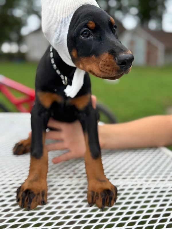 Puppies come with tails and dew claws done, vaccines, deworming, microchip, AKC limited registration, 1-month free pet insurance, vet check, puppy pack with blanket with mom’s scent & additional puppy information. Ear crop is optional & additional cost. We are located in Iowa.