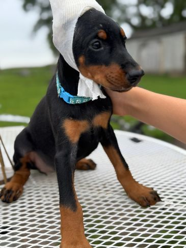 Puppies come with tails and dew claws done, vaccines, deworming, microchip, AKC limited registration, 1-month free pet insurance, vet check, puppy pack with blanket with mom’s scent & additional puppy information. Ear crop is optional & additional cost. We are located in Iowa.